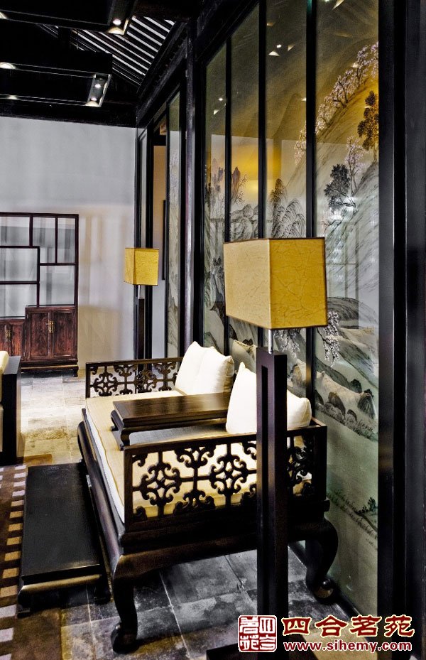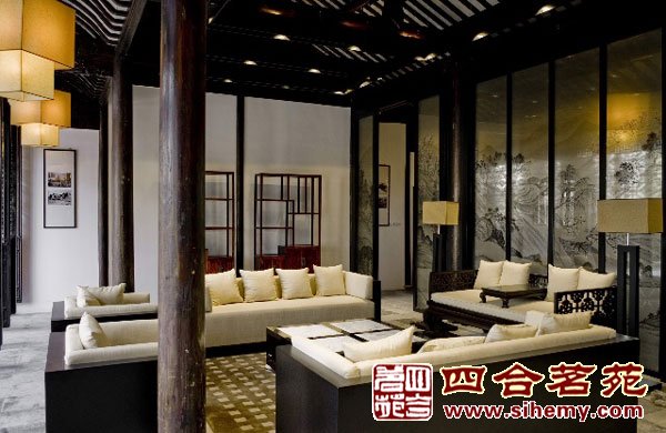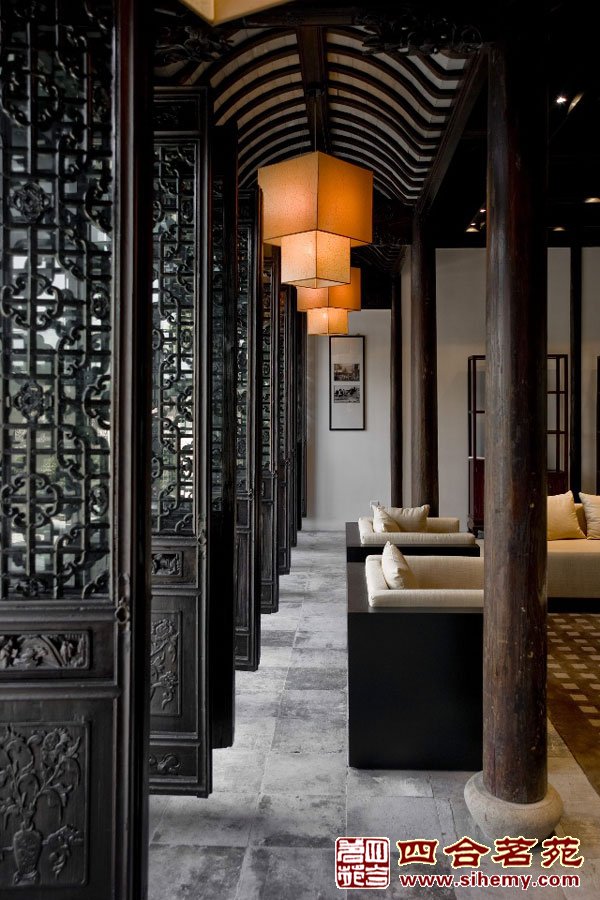 飞檐、廊角含蓄而古朴,木门、圆柱保留了老建筑的神韵,简化的现代灯笼设计、中式茶几与现代布艺沙发的结合,营造了舒适、惬意的氛围。