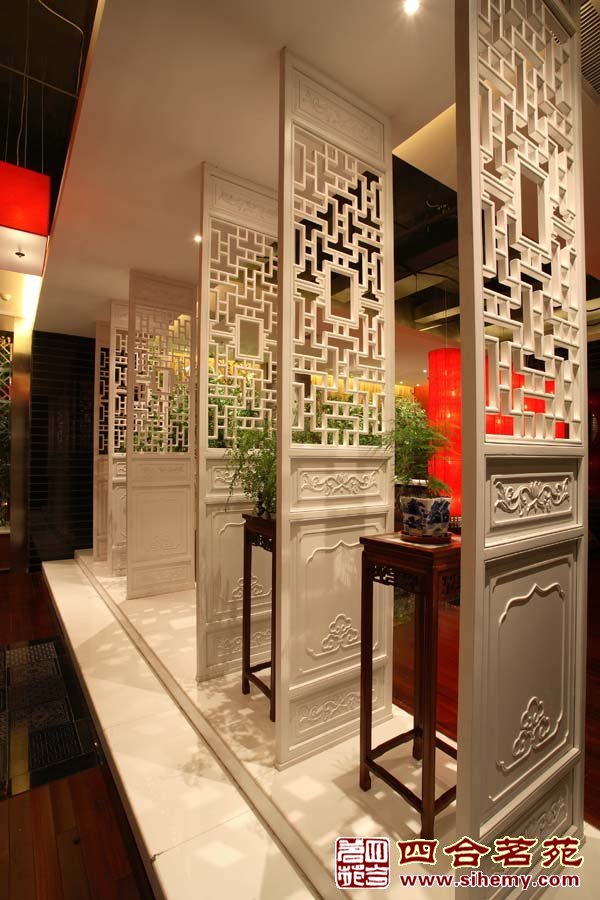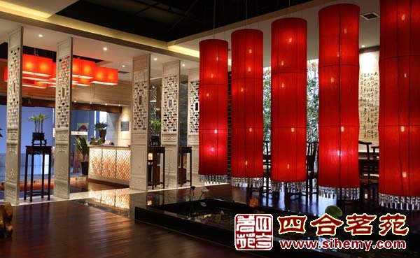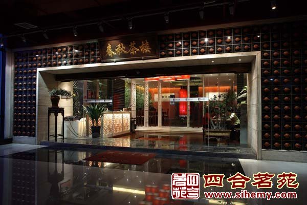 春秋茶楼位于闹市区某大厦的层,建筑现状给茶楼氛围的营造摆了一个难题。反其道而行之,过滤嘈杂的闹市,浮出僻静的“小院”,以院落概念营造茶文化氛围,与大厦与闹市形成了一个鲜明的对比,给繁忙的都市人在嘈杂的闹市内,有了一个在僻静“小院”中偷闲的机会。 茶楼以“三进院”演绎着中国传统民居的建筑构局,散发着茶的芳香,院中有“房”“房”内有“屋”,“房”与“房”错落有致,围合着三个情节小院。“一院” 门海,“二院”戏台,“三院”枯山水。一步一景,一院一个情节。现代手法的大红吊灯让院里有了主角,让屋外的灰砖墙添了几分亲切与柔和,角落里的绿植让空 间更加自然,让“院”中人忘却闹市回荡在茶文化和东方建筑精神的回忆之中。