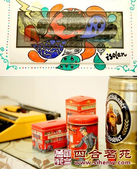 老式的打字机、仿古的电话机、老式罐头收集在钢琴架上方。还有上方的电闸开关,你一定没发现吧,因为它被主人重新包装了,像个明星一样骄傲、张扬。