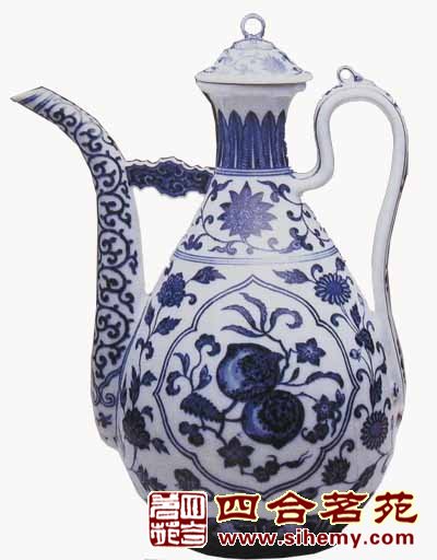 成熟的青花瓷出现在元代的景德镇。元青花瓷的胎由于采用了“瓷石+高岭土”的二元配方,使胎中的Al2O3含量增高,烧成温度提高,焙烧过程中的变形率减少。多数器物的胎体也因此厚重,造型厚实饱满。胎色略带灰、黄,胎质疏松。底釉分青白和卵白两种,乳浊感强。其使用的青料包括国产料和进口料两种:国产料为高锰低铁型青料,呈色青蓝偏灰黑;进口料为低锰高铁型青料,呈色青翠浓艳,有铁锈斑痕。在部分器物上,也有国产料和进口料并用的情况。器型主要有日用器、供器、镇墓器等类,尤以竹节高足杯、带座器、镇墓器最具时代特色。除玉壶春底足荡釉外,其它器物底多砂底无釉,见火石红。元青花的纹饰最大特点是构图丰满,层次多而不乱。笔法以一笔点划多见,流畅有力;勾勒渲染则粗壮沉着。主题纹饰的题材有人物、动物、植物、诗文等。人物有高士图(四爱图)、历史人物等;动物有龙凤、麒麟、鸳鸯、游鱼等;植物常见的有牡丹、莲花、兰花、松竹梅、灵芝、花叶、瓜果等;诗文极少见。所画牡丹的花瓣多留白边;龙纹为小头、细颈、长身、三爪或四爪、背部出脊、鳞纹多为网格状,矫健而凶猛。辅助纹饰多为卷草、莲瓣、古钱、海水、回纹、朵云、蕉叶等。莲瓣纹形状似“大括号”,莲瓣中常绘道家杂宝;如意云纹中常绘海八怪或折枝莲花、缠枝花卉,绘三阶云;蕉叶中梗为实心(填满青料);海水纹为粗线与细线描绘相结合。