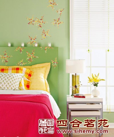 床头的背景墙和床头板都是纯绿色,色度不一样,可在建材卖场或网上购买墙贴,挑选跟绿背景颜色呼应的花朵图案最能展现春的气息。而且背景墙和背板选择一致的图案,统一性会使装饰更显协调。
