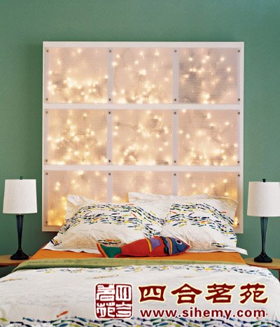 这块床头板能让你联想到圣诞节时透过结霜的玻璃窗看星星的情景。它是由结构简单的木质框架组成,首先将它钉在墙面上,并在木框架后面挂上几串小灯,你可以选择节日或开PARTY后剩余下的彩灯。节日串灯的光线透过半透明板过滤,显得格外柔和浪漫。