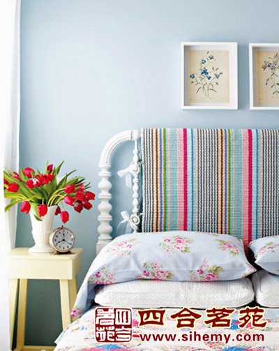 家居卖场会有耐磨的彩条纹挂毯,既可当垫子铺在沙发上也可铺在地上当脚垫,我们可以开发它的全新用途。挑选一块比床头板稍窄一些的挂毯直接搭在床头上,两边分别用窗帘钩夹将毯子固定在床柱上,并用丝带系出蝴蝶结。一个粗犷中带点温馨感的新床头就诞生了。