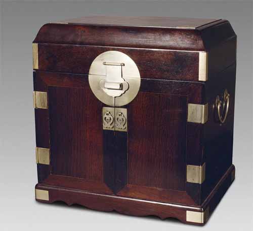 衣 箱的盖子一般是向上打开的, 正面有铜饰活锁,还有铜饰件及如意云纹拍子等。为了便于外出携带和挪动, —般形体不大彻且在箱子两侧装有提环。