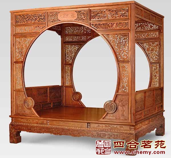 汉族卧具。床身上架置四柱、四杆的床。有的在两端和背面设有三面栏杆,有的迎面安置门罩,更有在前面设踏步并加设—罩(拔步床)等。式样颇多,结构精巧,装饰华美。装饰多以历史故事、民间传说、花马山水等为题材,含和谐、平安、吉祥、多福、多子等寓意。风格或古朴大方,或堂皇富丽。