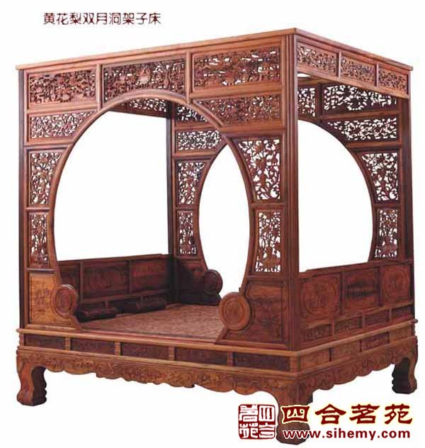 架子床在明家具中是体型较大的家具,做工精美,清雅别致,如以黄花梨木制作,弥足珍贵清代架 子床不仅用料厚乙形体高大,且围栏、床柱、牙板、四足及上楣板等全部镂雕花纹,还有在正面装垂花门的玲珑剔透。