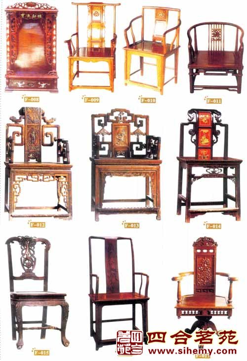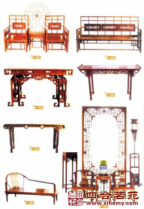 硬木家具 古典家具按质地可分为两大茎:漆饰家具和硬木家具。漆饰家具从原始社会开始至明清乃至现代始终沿用不衰,可以说贯穿了中国家具史的始终;而紫檀、黄花梨等硬木家具的出现则应是明代隆庆、万历以后的事了。明式家具多用花梨木、紫檀木,鸡翅木及铁梨木等硬木,也采用楠木、樟木、胡桃木、榆木及其他硬杂木,其中以花梨木中的黄梨木效果最好。这些硬木色泽柔和,纹理清晰坚硬而又富有弹性。这种材料对家具造型结构、艺术效果有很大的影响。由于木质坚硬而有弹性,且硬木是比较珍贵的木料,所以家具用料的横断面制作很小。为此,造型也就显得线型简练、挺拔和轻巧。清式家具 选料极为精细,表里如一,无节,无伤,完整得无一瑕疵。硬木家具的部件和零部件,如抽屉板、桌底板及穿带等,所用的木料都是硬木。若按其使用功能分,硬木家具大体可分为床榻类、椅凳类、桌案类、柜橱类、屏风类、台架类及木器杂件等。